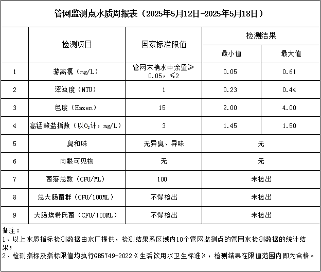 管網(wǎng)監(jiān)測(cè)點(diǎn)水質(zhì)周報(bào)表(2025年5月12日-2025年5月18日)
