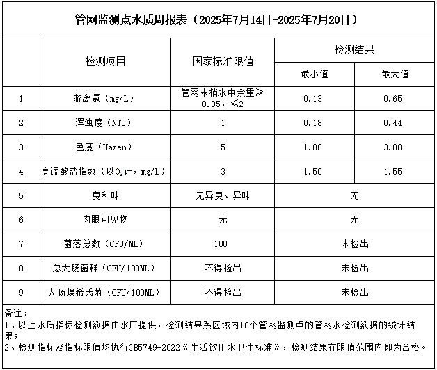 管網(wǎng)監(jiān)測點水質(zhì)周報表(2025年7月14日-2025年7月20日)