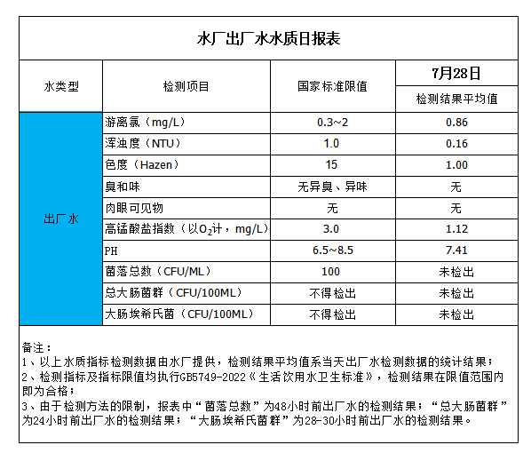 水廠出廠水水質(zhì)日報表(2023-7-28)