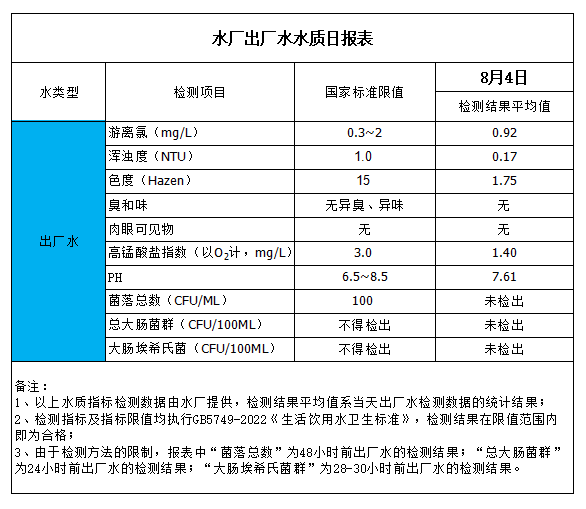 水廠出廠水水質(zhì)日報表(2023-8-4)