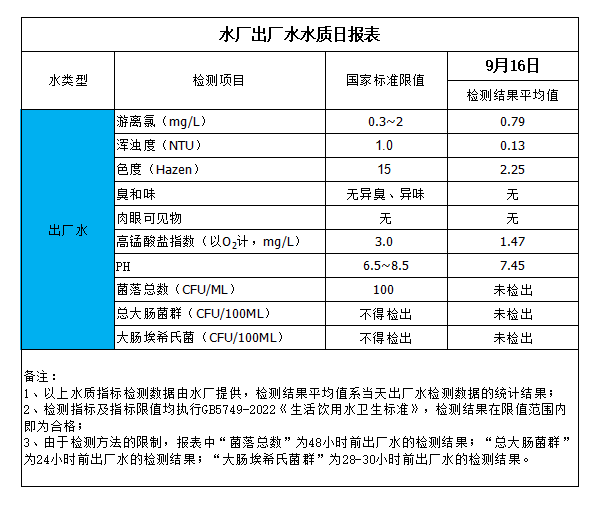 水廠出廠水水質(zhì)日?qǐng)?bào)表(2023-9-16)