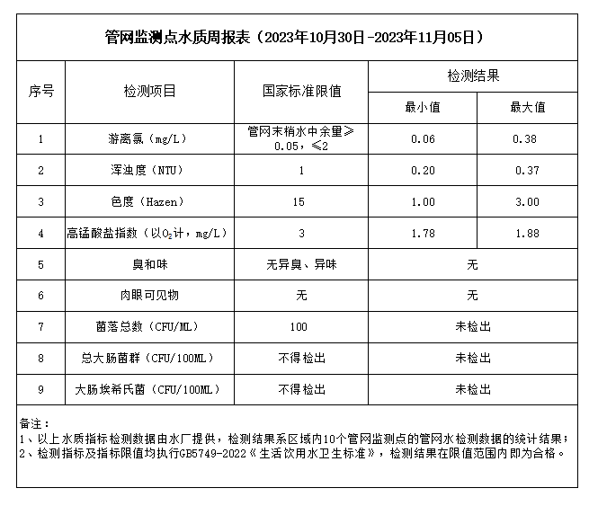 管網(wǎng)監(jiān)測點(diǎn)水質(zhì)周報(bào)表(2023年10月30日-2023年11月05日)