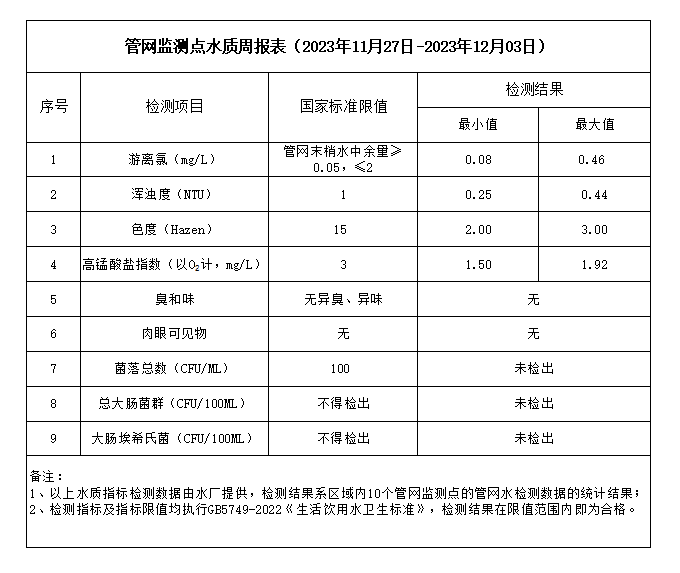 管網(wǎng)監(jiān)測點(diǎn)水質(zhì)周報(bào)表(2023年11月27日-2023年12月03日)