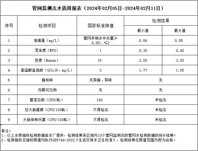 管網(wǎng)監(jiān)測點水質(zhì)周報表(2024年02月05日-2024年02月11日)