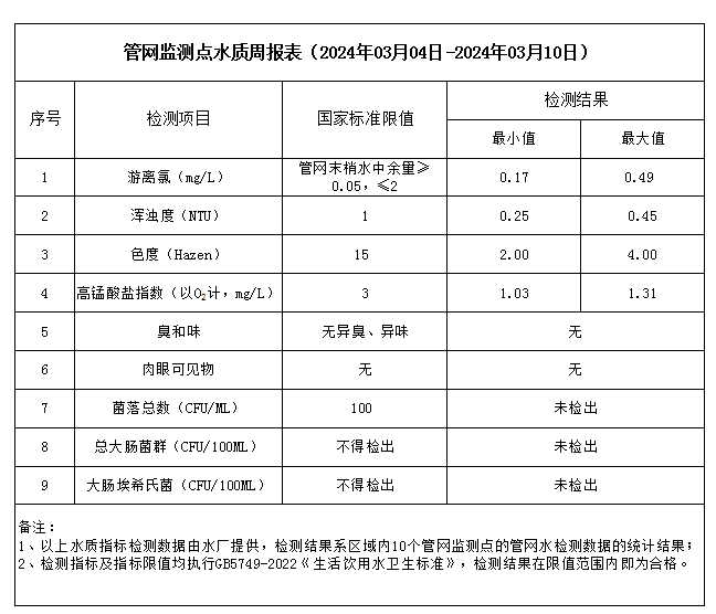 管網(wǎng)監(jiān)測(cè)點(diǎn)水質(zhì)周報(bào)表(2024年03月04日-2024年03月10日)