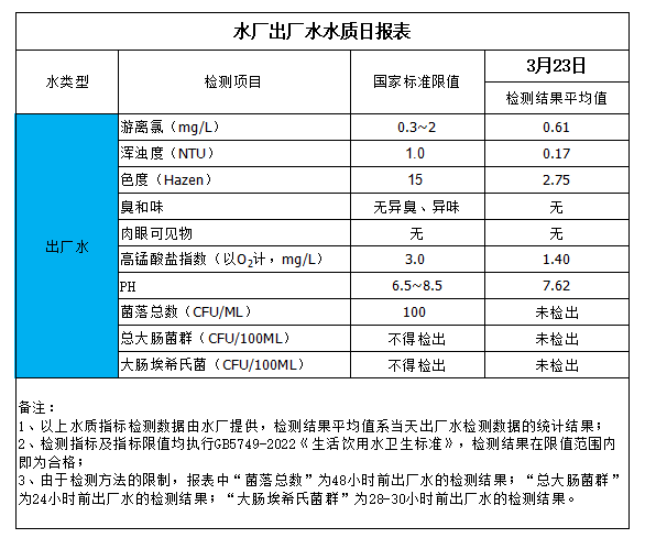 水廠出廠水水質(zhì)日報表(2024-3-23)