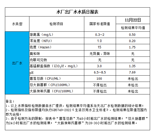 水廠出廠水水質(zhì)日?qǐng)?bào)表(2024-11-22)